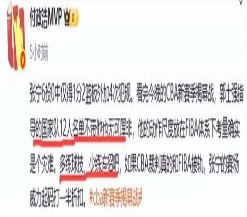 賽后付政浩發(fā)文稱,郭士強(qiáng)指導(dǎo)的國(guó)家隊(duì)12人名單不帶他也無(wú)可厚非,他的動(dòng)作尺度放在FIBA體系下考量確實(shí)是個(gè)災(zāi)難。多練球技、少練連招吧,如果CBA裁判真的和FIBA接軌,張寧的賽場(chǎng)威力起碼打一半折扣。山西球迷接受不了這一評(píng)價(jià),“僅憑一場(chǎng)比賽就能得出這樣的結(jié)論嗎?有點(diǎn)武斷了吧。”付政浩正色道:這還武斷?看了他四個(gè)賽季了,動(dòng)作一年比一年離譜。其實(shí)完全可以去跨界UFC試試。
