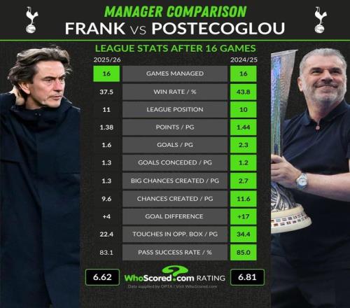 客場0-3不敵諾丁漢森林后,托馬斯-弗蘭克在北倫敦所承受的壓力進(jìn)一步加大,這賽季球隊(duì)的比賽風(fēng)格以及糟糕的主場戰(zhàn)績已經(jīng)讓球迷的不滿情緒不斷升溫,Whoscored也對比了弗蘭克本賽季前16輪和上賽季澳波前16輪的數(shù)據(jù)。