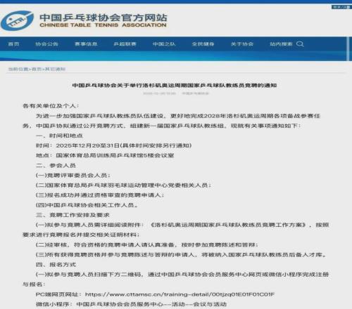 “乒乓世界”消息,中國乒乓球協(xié)會(huì)官網(wǎng)于12月20日正式發(fā)布《中國乒乓球協(xié)會(huì)關(guān)于舉行洛杉磯奧運(yùn)周期國家乒乓球隊(duì)教練員競聘的通知》,正式啟動(dòng)新周期國家隊(duì)教練員公開競聘工作。