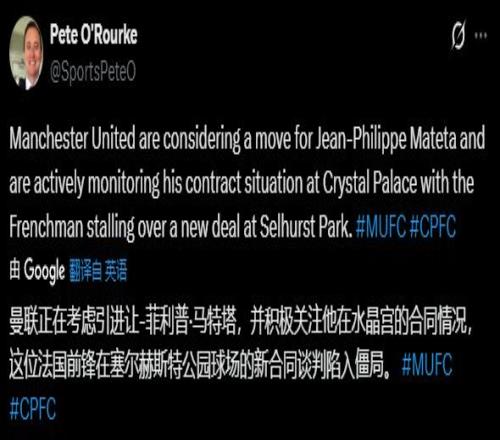 記者Pete O'Rourke透露:“曼聯(lián)正在考慮引進(jìn)馬特塔,并積極關(guān)注他在水晶宮的合同情況,這位法國(guó)前鋒同水晶宮的新合同談判陷入僵局。”實(shí)際上,水晶宮正面臨著嚴(yán)重的人員流失風(fēng)險(xiǎn)。過(guò)去一年,水晶宮的出色發(fā)揮令多名主力成為轉(zhuǎn)會(huì)市場(chǎng)香餑餑。夏窗埃澤已轉(zhuǎn)投阿森納;馬克·格伊合同臨近到期,夏窗差點(diǎn)加盟利物浦,預(yù)計(jì)下個(gè)夏窗自由離隊(duì)。
