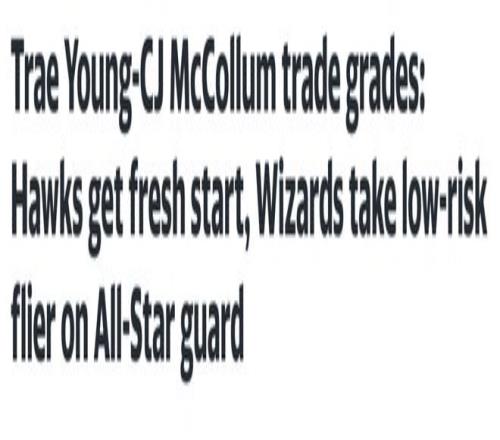 北京時(shí)間1月8日,老鷹和奇才達(dá)成一筆1換2的交易,老鷹送出特雷-楊,從奇才換來麥科勒姆和基斯珀特,這筆交易未涉及任何選秀權(quán)籌碼。隨后美媒雅虎體育對(duì)這筆交易進(jìn)行了評(píng)級(jí),老鷹獲得B的評(píng)分,而奇才獲得B+的評(píng)分。從目前來看,奇才更被看好成為這筆交易的贏家。