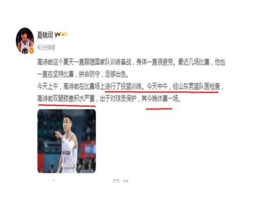 根據(jù)山東記者夏曉司表示,高詩巖雖然是參加了投籃訓(xùn)練,但是,根據(jù)隊醫(yī)的檢查,他的雙腿膝蓋積水嚴(yán)重,為了保護(hù)他,因此,本場比賽不會高詩巖參加,讓他可以進(jìn)行休養(yǎng)一下。