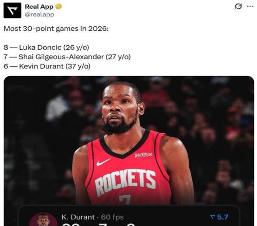 同時(shí)這也是杜蘭特進(jìn)入26年以來第6次單場(chǎng)砍下30+,高居聯(lián)盟第三,僅次于東契奇(8次)和亞歷山大(7次)。