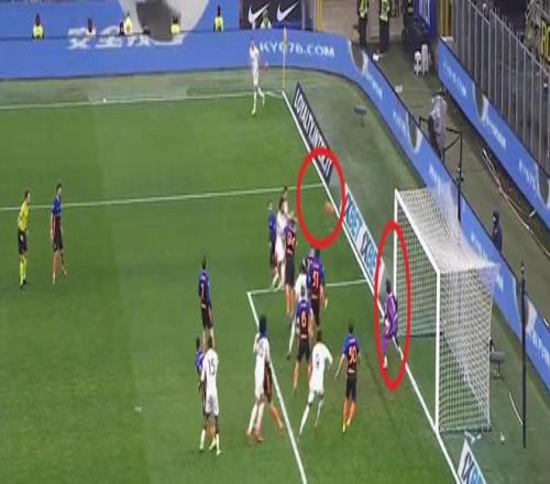 第二個丟球,同樣是姆希塔良在區(qū)域防守的時候,處在了前點一個根本沒有進攻球員的區(qū)域;按照正常的思路,此時姆希塔良應(yīng)該能夠判斷出球的落點大概位置,并向后退一步依靠住進攻球員,但也不知道是沒反應(yīng)過來還是怎么的,姆希塔良一動沒動,只是目送的皮球越過自己的頭頂。當然,這也可能是球隊在練習(xí)區(qū)域防守角球時的硬性要求導(dǎo)致的,那么那就是另一個問題了,我相信晚些時間,老維很可能在今天的比賽分析當中著重解釋這個丟球的防守問題。區(qū)域防守已經(jīng)多次失效,國米需要盡快調(diào)整。