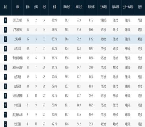 迄今為止,戰(zhàn)績排在北京隊(duì)前面的隊(duì)伍,分別是衛(wèi)冕冠軍廣廈隊(duì)(16-2)、廣東隊(duì)(15-4)和上海隊(duì)(15-3)。