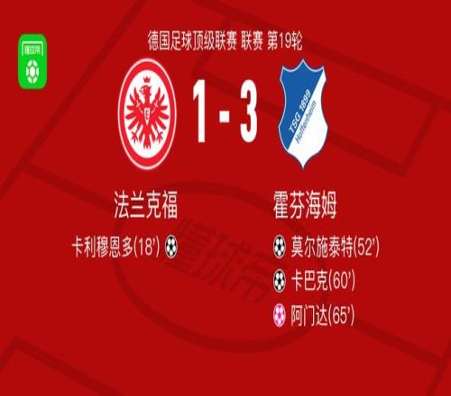 北京時(shí)間1月24日,德國(guó)足球頂級(jí)聯(lián)賽第19輪,法蘭克福主場(chǎng)對(duì)陣霍芬海姆??ɡ露鞫嗦氏绕崎T(mén),為法蘭克福取得領(lǐng)先;隨后莫爾施泰特破門(mén),卡巴克再入一球,霍芬海姆連扳兩球反超;阿門(mén)達(dá)不慎自擺烏龍,令霍芬海姆擴(kuò)大優(yōu)勢(shì)。最終,法蘭克福1比3不敵霍芬海姆。