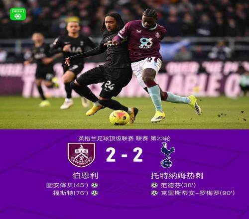 北京時間1月24日,英格蘭足球超級聯(lián)賽第23輪,伯恩利主場對陣托特納姆熱刺。上半場,范德芬打破僵局。沃克傳中,圖安澤貝扳平比分。下半場,福斯特破門幫助伯恩利反超比分。比賽尾聲階段,羅梅羅沖頂完成絕平。全場比賽結(jié)束,熱刺2-2戰(zhàn)平伯恩利,遭遇英超聯(lián)賽連續(xù)5輪不勝。